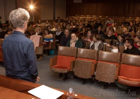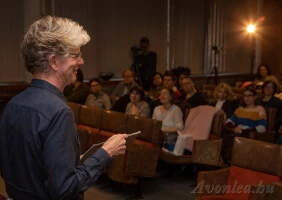 Aztán a tervezett délután három óra előtt, kicsivel fél három után meg is érkezett az esemény fő attrakciója, John Welsman zeneszerző. Volt egy kis technikai probléma a prezentációja előkészítésével, a laptopját nem tudtuk rákötni a projektorra. Végül az én laptopomról mutatta be azt a 2 videót, ami kellett a prezentációjához.